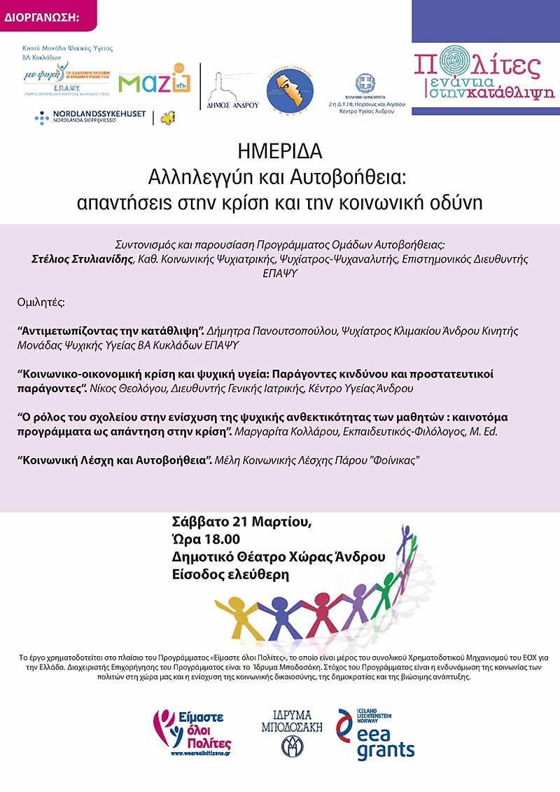 Ημερίδα με θέμα, Αλληλεγγύη και Αυτοβοήθεια: Απαντήσεις στην κρίση και την κοινωνική οδύνη θα γίνει το Σάββατο 21 Μαρτίου στις 18.00 στο Δημοτικό Θέατρο της Χώρας, με ελεύθερη είσοδο.