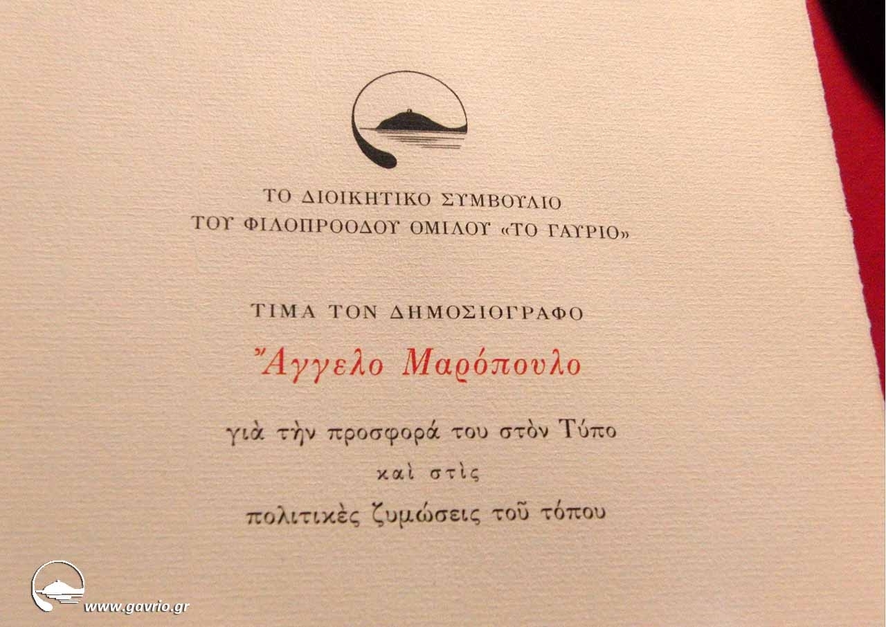 Η βραδιά ξεκίνησε με ενα μαγνητοσκοπημένο μήνυμα του δημοσιογράφου και στιχουργού Λευτέρη Παπαδόπουλου, που μιας και δεν μπόρεσε να παρευρεθεί στην εκδήλωση θέλησε με αυτόν τον τρόπο να τιμήσει τον παιδικό του φίλο. Στην βραδιά παρευρέθηκαν και μίλησαν μεταξύ άλλων ο πρόεδρος των Ανδρίων Επιστημόνων και τότε κρατούμενος της χούντας Δημοσθένης Κόναρης και το ηγετικό στέλεχος του κινήματος του Πολεμικού Ναυτικού κατά της δικτατορίας ναύαρχος Νίκος Μανταδάκης που εξήραν κυρίως τον αγώνα του Άγγελου Μαρόπουλου κατά της δικτατορίας από την θέση του υποδιευθυντή της τότε ελληνικής εκπομπής της "Ντουτσε Βελλε" καθώς και την στήριξη αντιστασιακών ενεργειών που του "απέφεραν" 20 χρόνια κάθειρξη ερήμην από το έκτακτο στρατοδικείο της χούντας. Ανάλογο μήνυμα προς την εκδήλωση μας απέστειλε και ο τότε κυβερνήτης του αντιτορπιλικού ΒΕΛΟΣ ναύαρχος ε.α. Νικόλαος Παπάς και ο τότε σημαιοφόρος του υποναύαρχος ε.α. Κωστής Γκορτζής που με την "ανταρσία" τους κατάφεραν ισχυρό πλήγμα κατά των συνταγματαρχών -που ισχυρίζονταν μέχρι τότε ότι εκπροσωπούσαν τις ένοπλες δυνάμεις- και συνέβαλαν αποφασιστικά στην πτώση της χούντας. Μίλησαν επίσης ο πρόεδρος του Ο.Λ.Π. Γιώργος Ανωμερίτης, η ευρωβουλευτής Άννυ Ποδηματά, η παλαίμαχη δημοσιογράφος Σοφία Μαλτέζου, ο εκδότης Γιώργος Δαρδανός καθώς και ο Δήμαρχος της Άνδρου Γιάννης Γληνός. Ο πρόεδρος μας, Γιάννης Μαμάης εξήρε τέλος την σοβαρή δημοσιογραφική δουλειά του Άγγελου Μαρόπουλου που μετά την χούντα διετέλεσε αρθρογράφος της ΜΕΣΗΜΒΡΙΝΗΣ και της ΚΑΘΗΜΕΡΙΝΗΣ, δίνοντας δείγματα αντικειμενικής και υπεύθυνης δημοσιογραφίας. Κλείνοντας δε την βραδιά, του απένειμε εκ μέρους του συλλόγου μας, τιμητικό δίπλωμα.