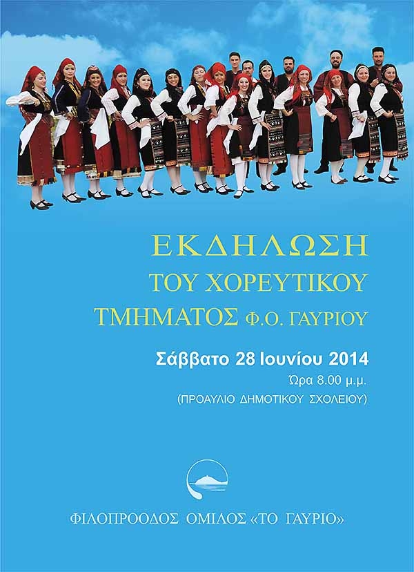 Το Σάββατο 28 Ιουνίου 2014 και ώρα 20:00 το Χορευτικό Τμήμα του Φιλοπρόοδου Ομίλου “το Γαύριο” , προσκαλεί όλους όσους αγαπούν το δημοτικό μας τραγούδι και τους παραδοσιακούς χορούς να παρακολουθήσουν την εκδήλωση που οργανώνει στον προαύλιο χώρο του Δημοτικού Σχολείου Γαυρίου με θέμα “ταχτιρντί και ταχτιρντό το παιδι θέλει χορό”. Η εκδήλωση γίνεται με την λήξη των μαθημάτων της χορευτικής περιόδου και συμμετέχουν οι μικρές ομάδες του χορευτικού. Θα ακολουθήσει νησιώτικο γλέντι καθώς και μπουφές που τον οργανώνουν οι χορευτές του συλλόγου και οι γονείς των μαθητών.