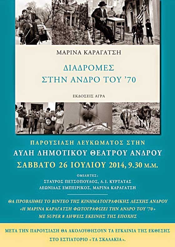 Στην αυλή του Δημοτικού Θεάτρου Άνδρου το Σάββατο 26 Ιουλίου 2014 και ώρα 9:30μμ για το λεύκωμα: Μαρίνα Καραγάτση - Διαδρομές στην Άνδρο του '70.