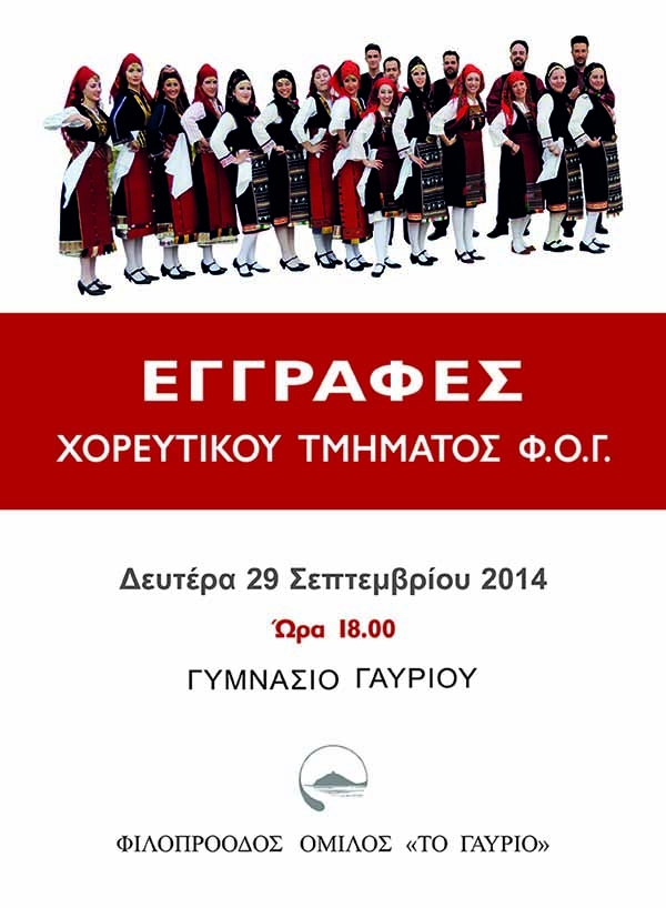 Την Δευτέρα 29 Σεπτεμβρίου στις 18:00, στο Γυμνάσιο του Γαυρίου, θα γίνουν οι εγγραφές στο Χορευτικό Τμήμα του Συλλόγου μας.