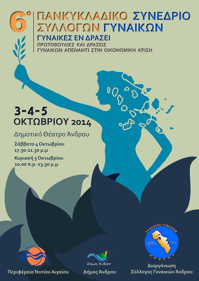 Το 6ο Πανκυκλαδικό Συνέδριο Συλλόγων Γυναικών που διοργανώνει ο Σύλλογος Γυναικών Άνδρου, με την αρωγή της Περιφέρειας Νοτίου Αιγαίου και του Δήμου Άνδρου, θα γίνει από τις 3 μέχρι τις 5 ΟΚτωβρίου στο Δημοτικό Θέατρο της Χώρας.