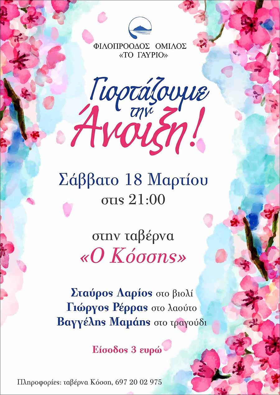 Θα χαρούμε πολύ να παρευρεθείτε στο γλέντι μας για να γιορτάσουμε όλοι μαζί τον ερχομό της άνοιξης το Σάββατο 18 Μαρτίου 2017, στις 21.00 στην ταβέρνα «Ο Κόσσης» με παραδοσιακή μουσική από τους Σταύρο Λαρίο στο βιολί, Γιώργο Ρέρρα στο λαούτο και Βαγγέλη Μαμάη στο τραγούδι.