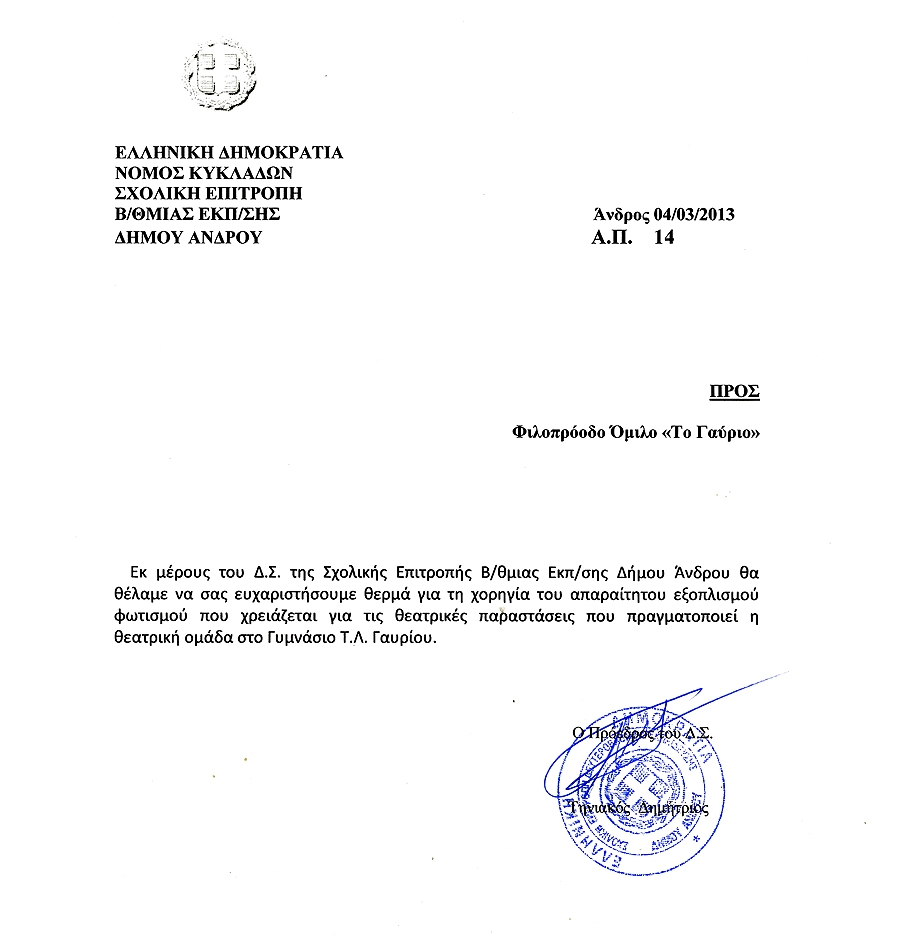 Από τη Σχολική Επιτροπή Β/Βάθμιας Εκπαίδευσης του Δήμου Άνδρου λάβαμε ευχαριστήρια επιστολή σχετικά με τη χορηγία του επαγγελματικού φωτισμού που έκανε ο Σύλλογος μας για τις ανάγκες της θεατρικής ομάδας του Γυμνασίου.